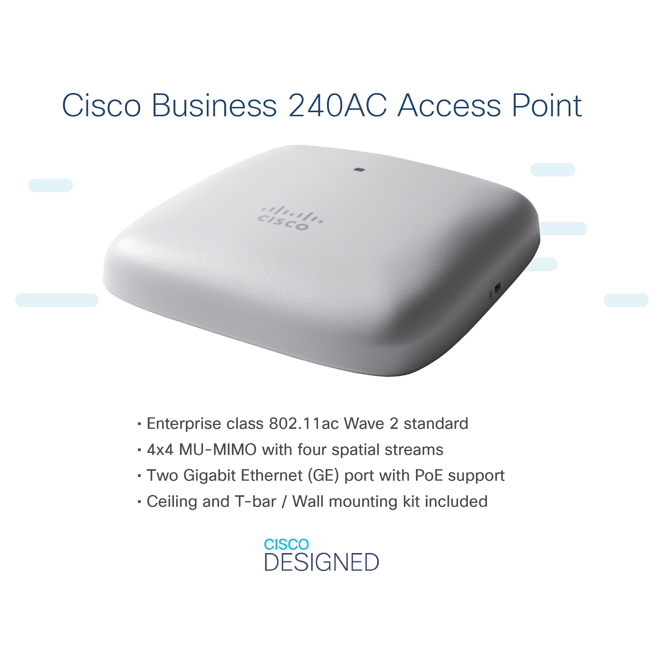 Access Point Cisco CBW240AC – Bardhë është një pajisje Wi-Fi e avancuar, e projektuar për të ofruar mbulim të qëndrueshëm dhe performancë të lartë në ambiente biznesi dhe komerciale.