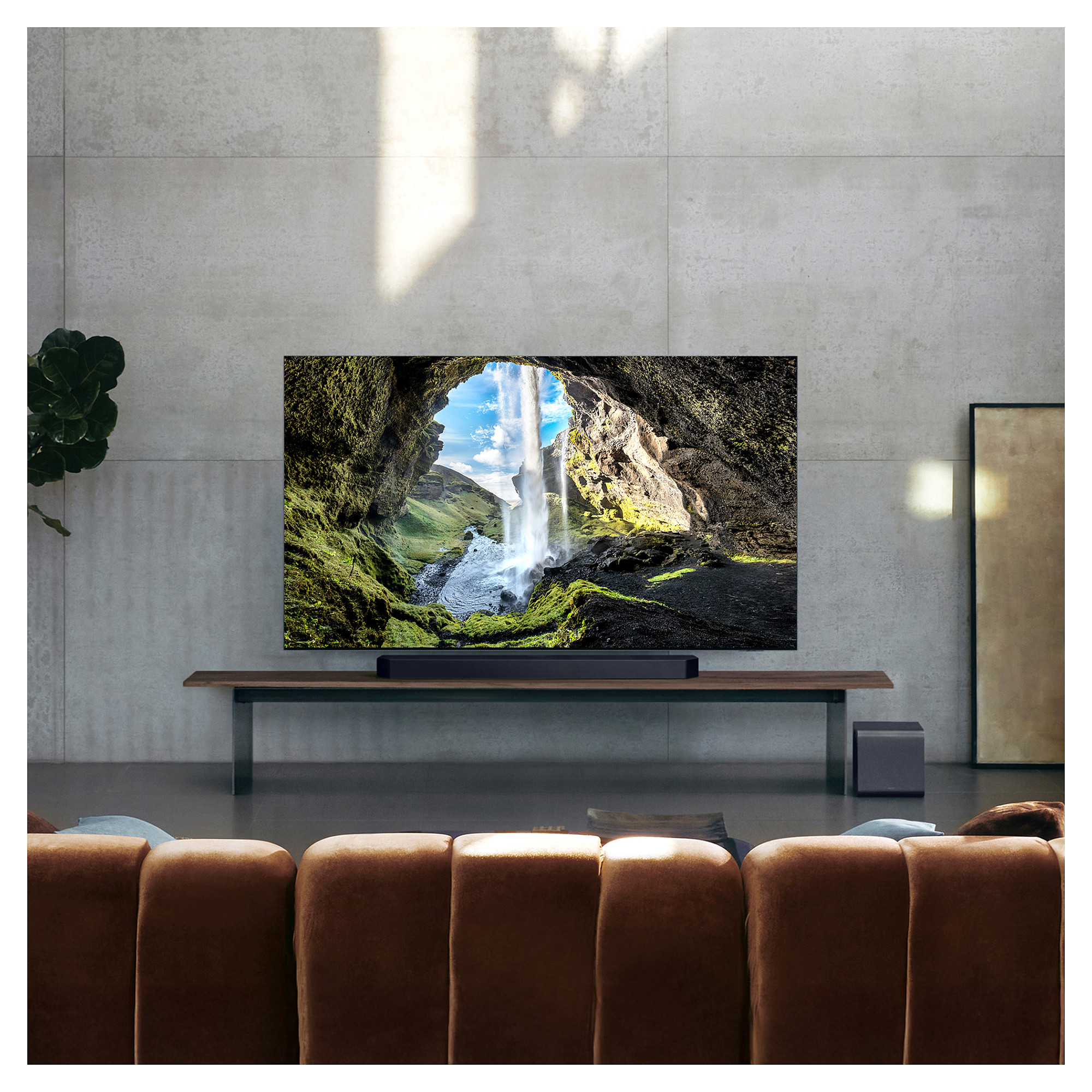 Teknologjia Q‑Symphony bashkon tingullin e televizorit Samsung me soundbar për një efekt më të pasur, ndërsa SpaceFit Sound Pro përshtat automatikisht tingullin sipas hapësirës.