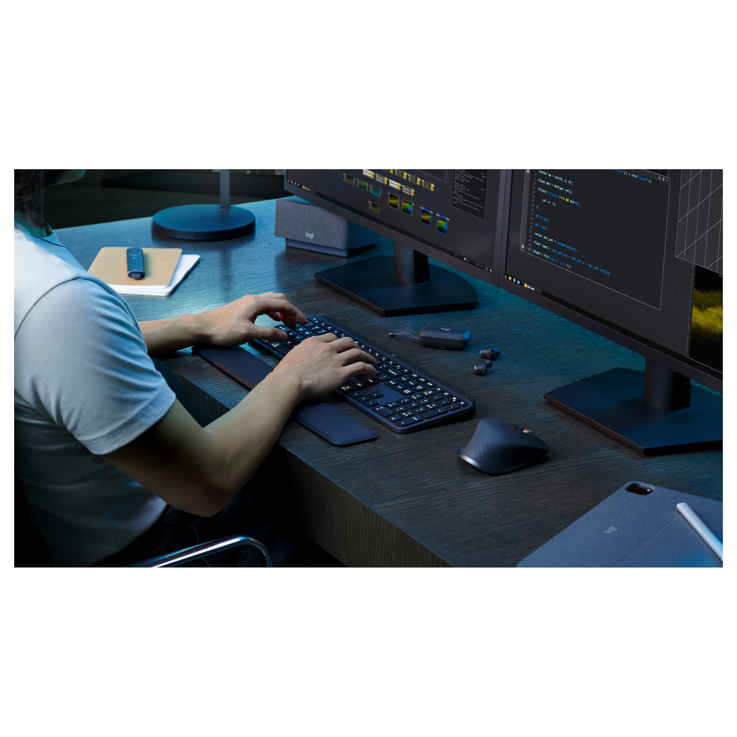Tastiera ofron ndriçim inteligjent, prekje të qeta dhe ergonomi për shkrim të rehatshëm, ndërsa mausi është saktës dhe ergonomik për kontroll të saktë.