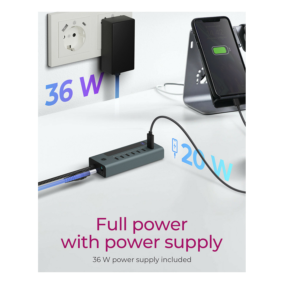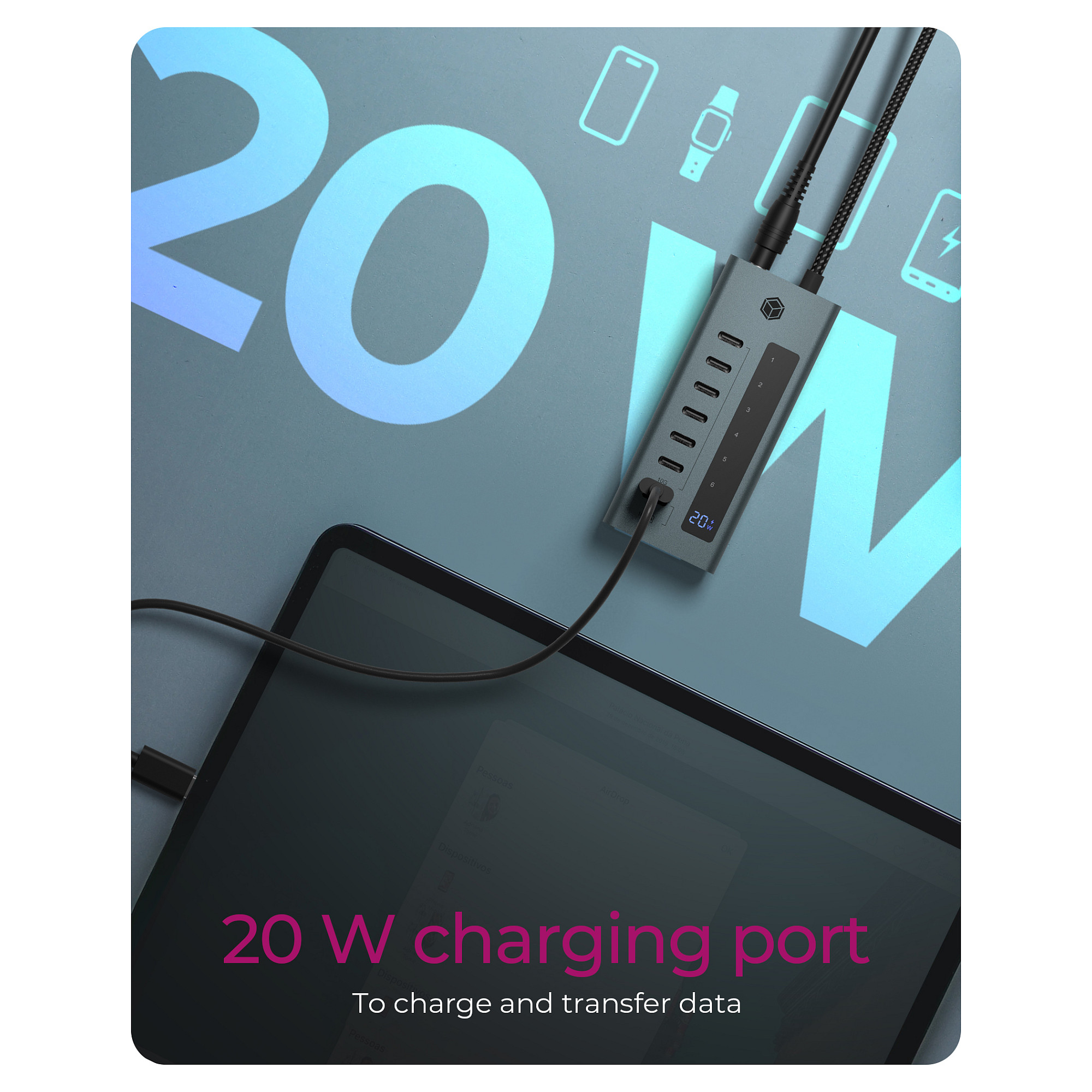Me 7 porta USB‑C, ky HUB siguron lidhje të shpejta dhe të besueshme për pajisje periferike, duke mbështetur standardin USB 3.2 Gen 1/2.
