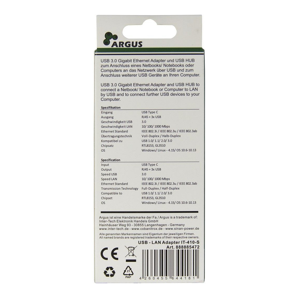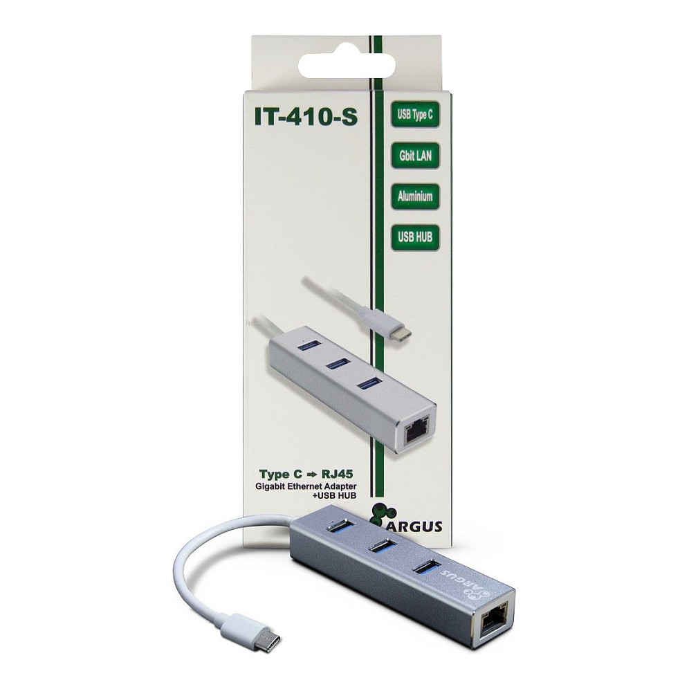 HUB Inter‑Tech Argus IT‑410‑S / USB‑C / 3×Ports / 1×RJ45 Gigabit LAN / Passive – Gri