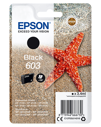 INK Epson 603 – Zezë është një kartrixh origjinal për printerët inkjet Epson, i projektuar për të ofruar tekst të qartë dhe ngjyra të zeza të thella në çdo printim.