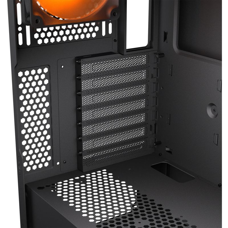 Paneli anësor prej xhami të temperuar ekspozon qartë komponentët, ndërsa hapësira e brendshme mbështet konfigurime ATX, radiatorë të mëdhenj dhe menaxhim të pastër të kabllove.