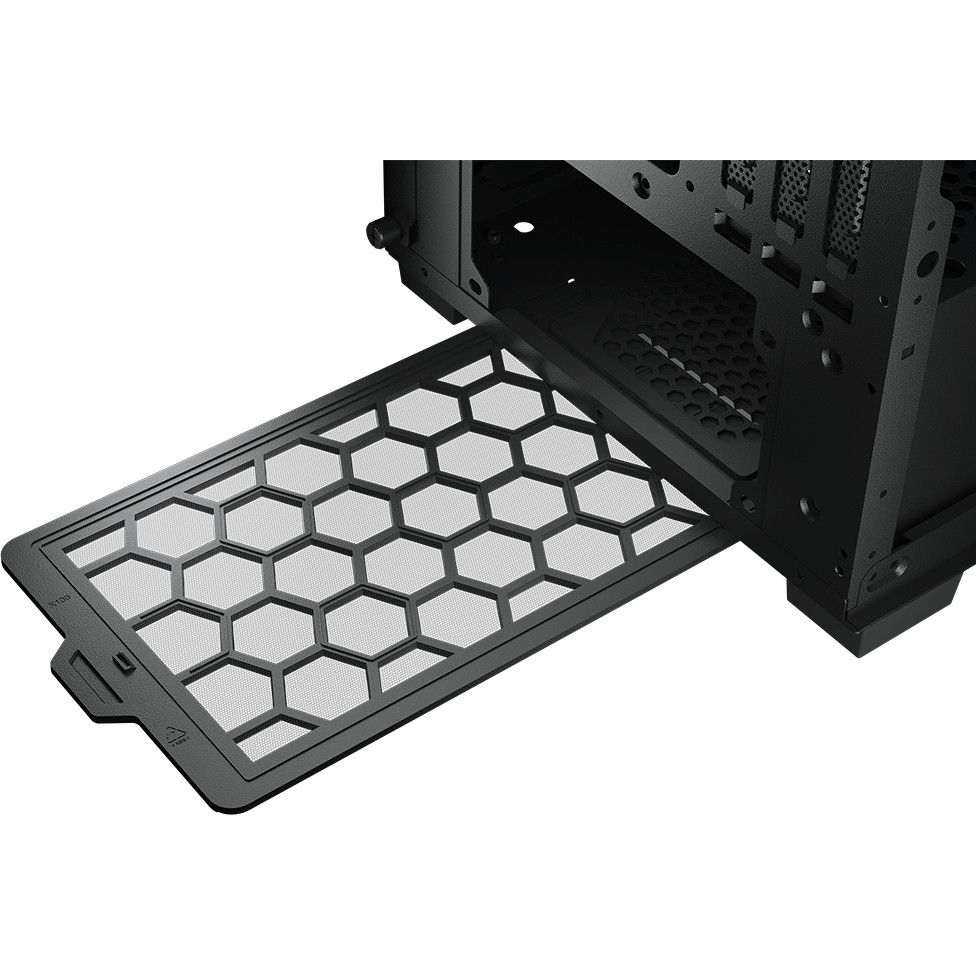 Struktura e zezë elegante kombinon estetikën premium me hapësirë të bollshme për instalimin e komponentëve të fuqishëm.