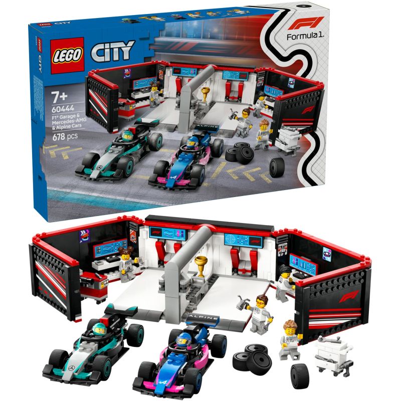 Ky set LEGO City sjell dy makina zyrtare Formula 1 – Mercedes-AMG dhe BWT Alpine – bashkë me një garazh të ndërtueshëm, plot vegla, goma dhe trofe.