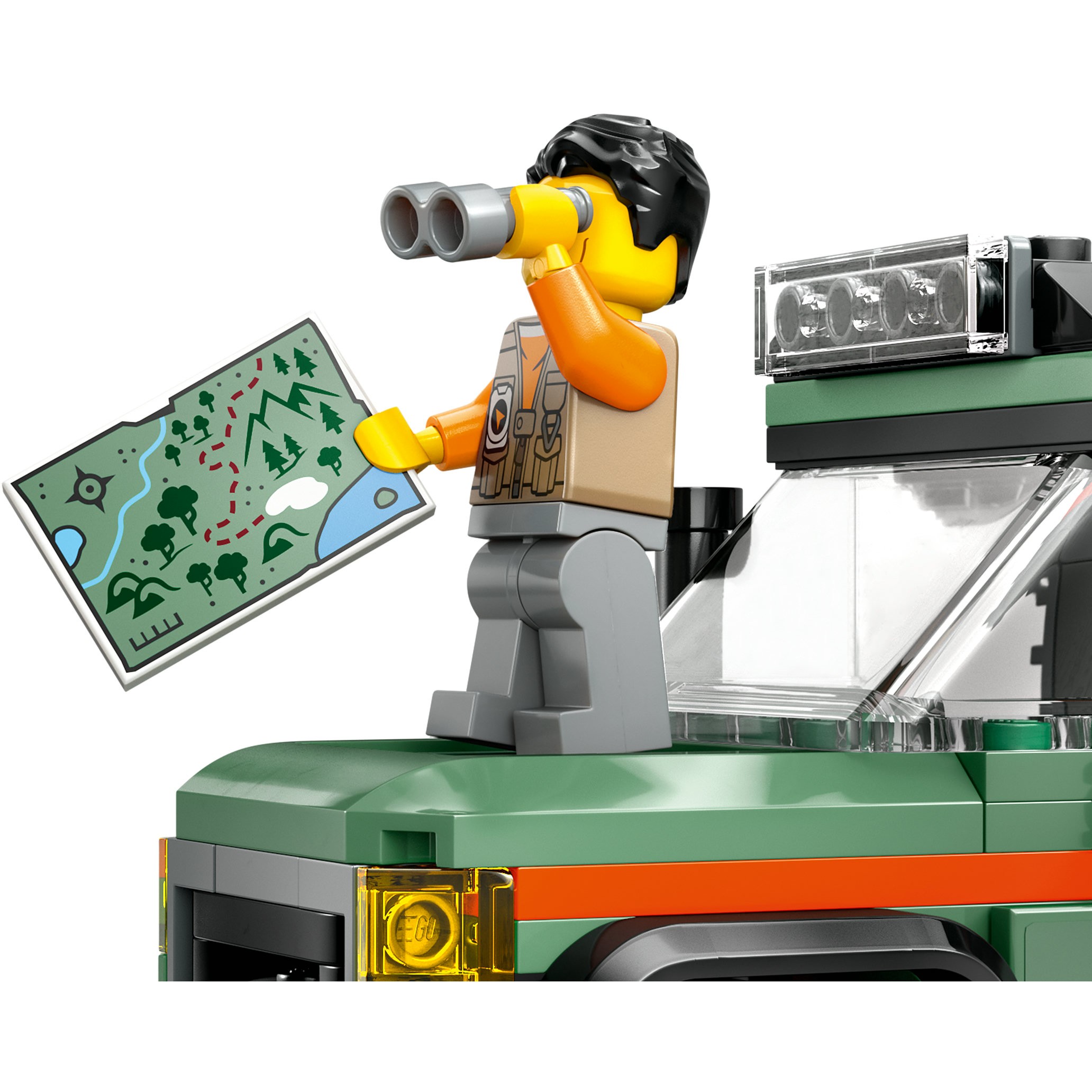 Përfshin një SUV me goma të mëdha, një rimorkio me kanoe, dy minifigura eksploruesish dhe aksesorë si veshje shpëtimi, peshk dhe kamera.