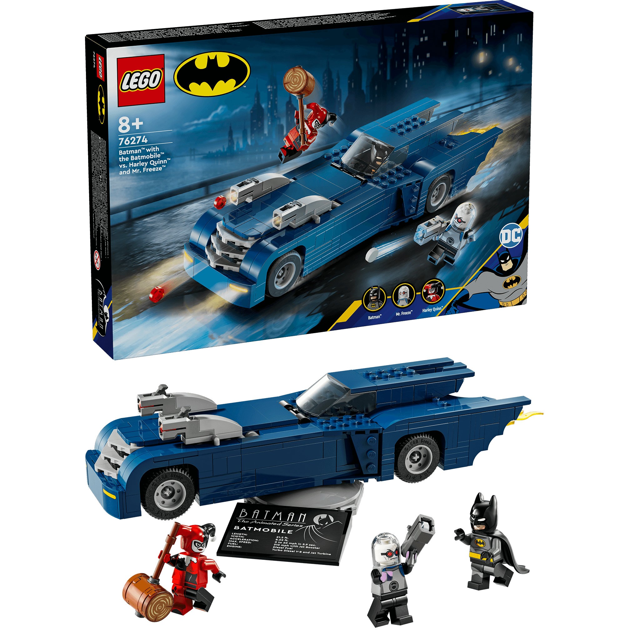 Ky set përfshin Batmobile-in e fuqishëm të Batman-it, Harley Quinn, Mr. Freeze dhe aksesorë të ndërtueshëm.