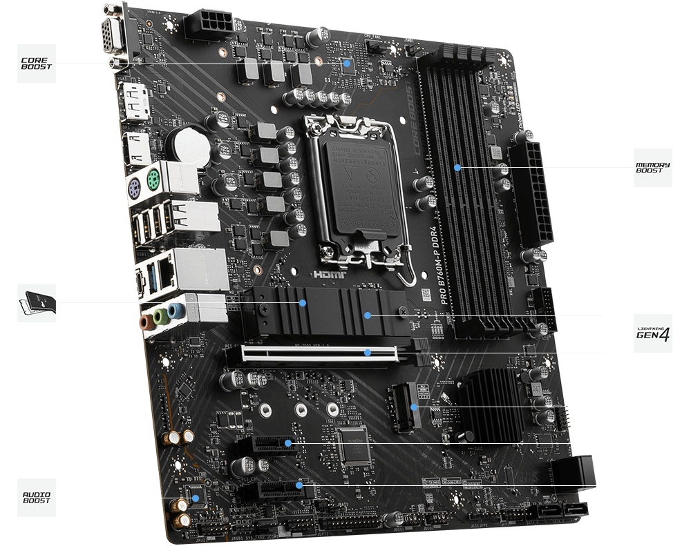 MSI PRO B760M-P është një motherboard Micro ATX i krijuar për procesorët e gjeneratës së 12-të dhe të 13-të të Intel-it, duke përdorur prizën LGA 1700. Ai mbështet memorien DDR4, duke siguruar një ekuilibër të performancës dhe efikasitetit të kostos. Kjo motherboard ofron opsione të fuqishme lidhjeje, duke përfshirë porta të shumta USB 3.2 Gen1, dalje HDMI dhe DisplayPort për konfigurime të gjithanshme të ekranit dhe lojëra elektronike PCIe 4.0 për kartat e zgjerimit me shpejtësi të lartë. Me faktorin e tij kompakt të formës Micro ATX, është ideal për ndërtime më të vogla pa kompromentuar veçoritë. MSI PRO B760M-P është ndërtuar duke pasur parasysh qëndrueshmërinë dhe qëndrueshmërinë, duke e bërë atë një zgjedhje të besueshme për nevojat profesionale dhe personale të kompjuterit.