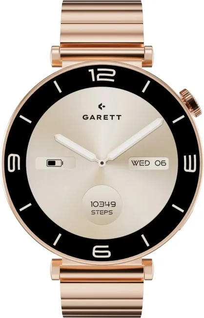 Garett është një orë e mençur me dizajn elegant dhe material çelik të qëndrueshëm, e kombinuar me nuanca ari dhe rozë për pamje luksoze dhe moderne.
