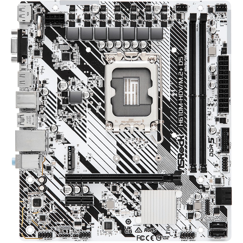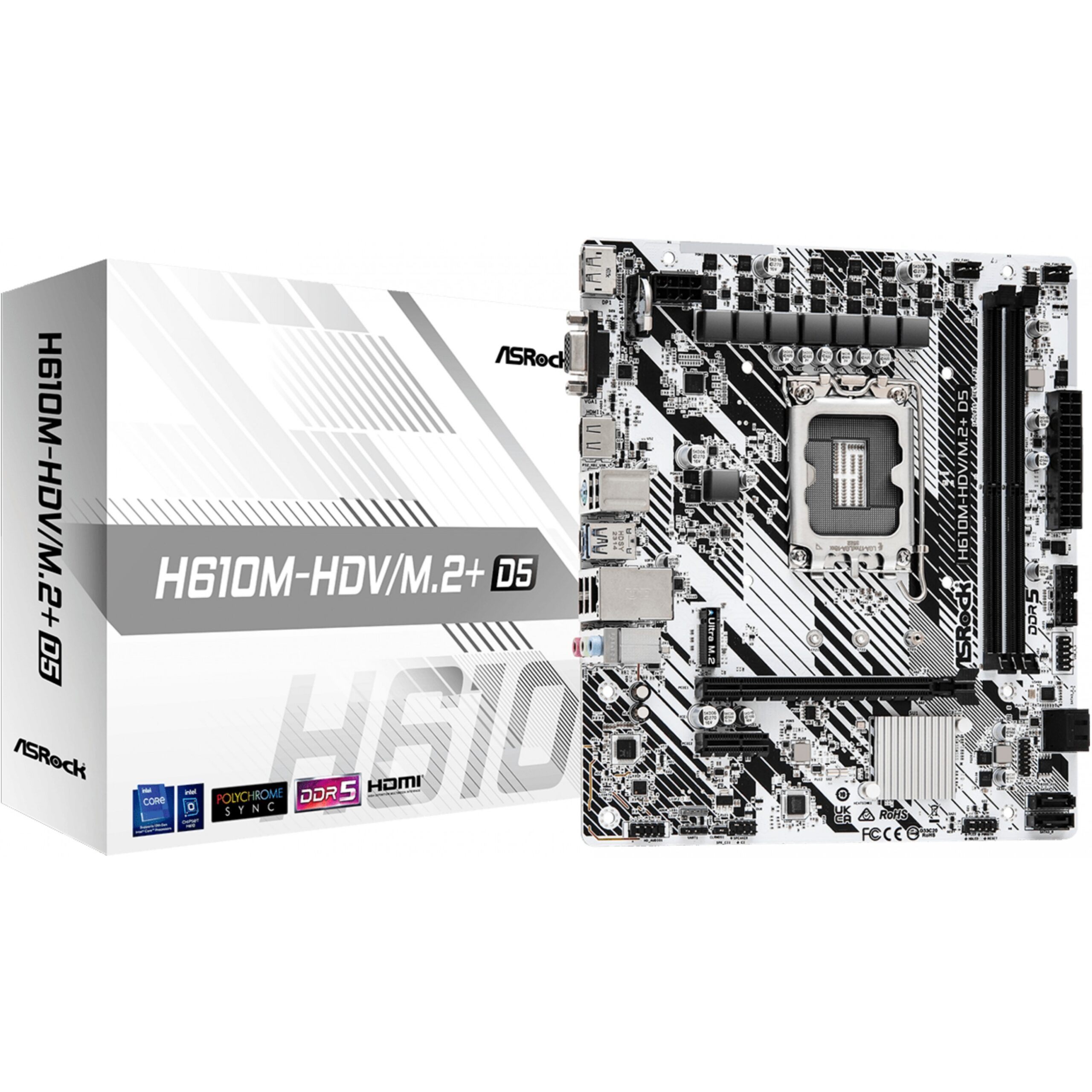 ASRock H610M-HDV/M.2+ D5 është pllakë amë micro-ATX me socket LGA1700 për procesorë Intel Core i9/i7/i5/i3 Gen 12/13/14, Pentium Gold, dhe Celeron.