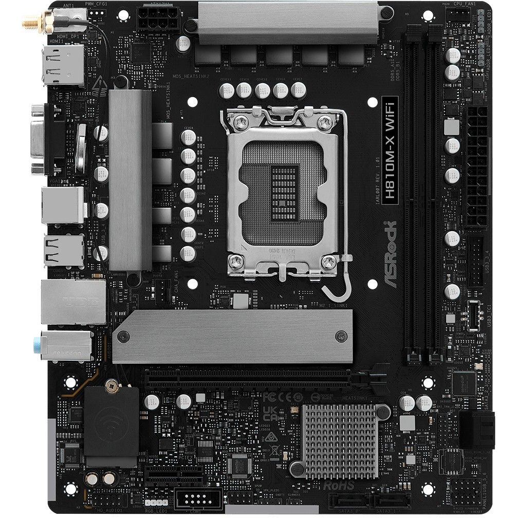 ASRock H810M-X WiFi është pllakë amë micro-ATX me socket LGA1851 për procesorë Intel Core Ultra Series 2 dhe Gen 14/15.