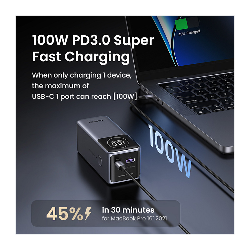 Me dalje 100W Fast Charging, ky model është i përshtatshëm për laptopë, tabletë dhe smartphone që kërkojnë energji intensive.