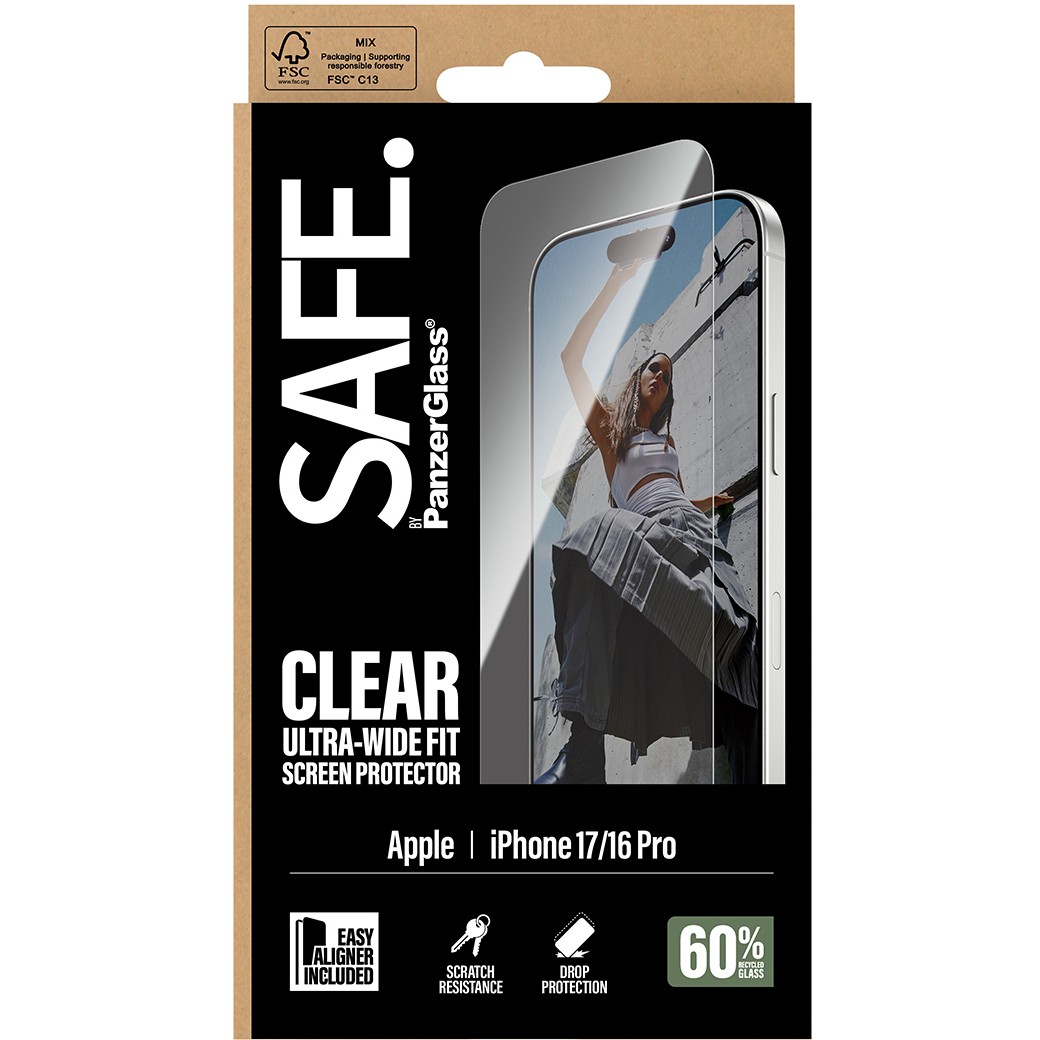 Mbrojtësja e ekranit SAFE Tempered për iPhone 17 / 16 Pro me dizajn Ultra-Wide Fit ofron mbulim maksimal dhe mbrojtje të fortë kundër gërvishtjeve dhe goditjeve.