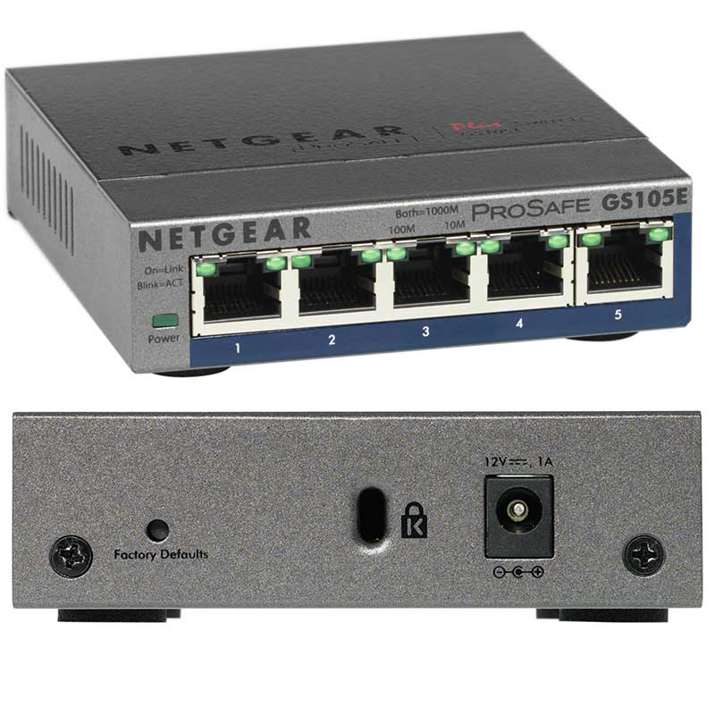 Switch Netgear GS105E / GS105E-200PES është një switch 5-portësh Gigabit Ethernet me funksione të avancuara të menaxhimit të trafikut si VLAN, QoS dhe monitorim i trafikut.
