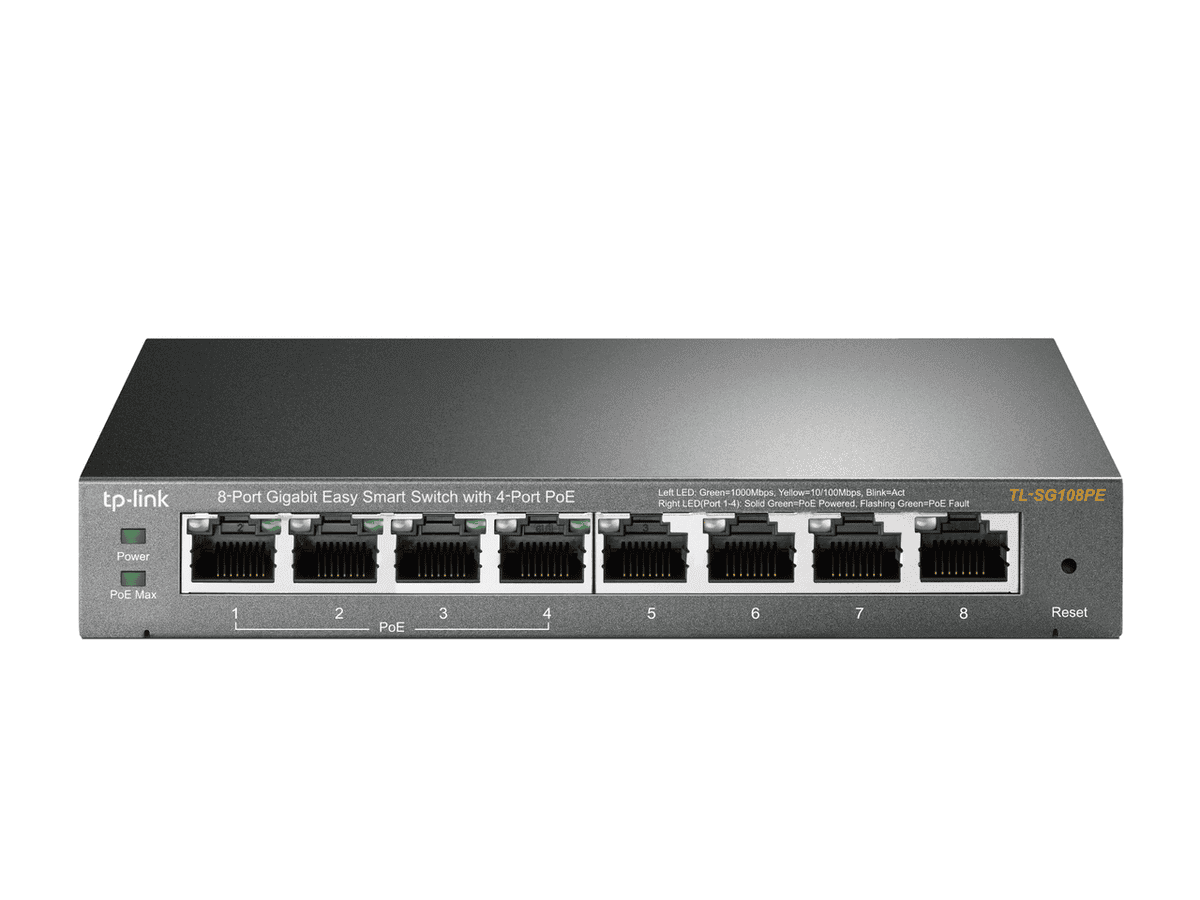 TP‑LINK TL‑SG108PE është switch 8‑portësh Gigabit Easy Smart me dizajn kompakt dhe gri, i përshtatshëm për zgjerimin e rrjetit në shtëpi ose zyrë.