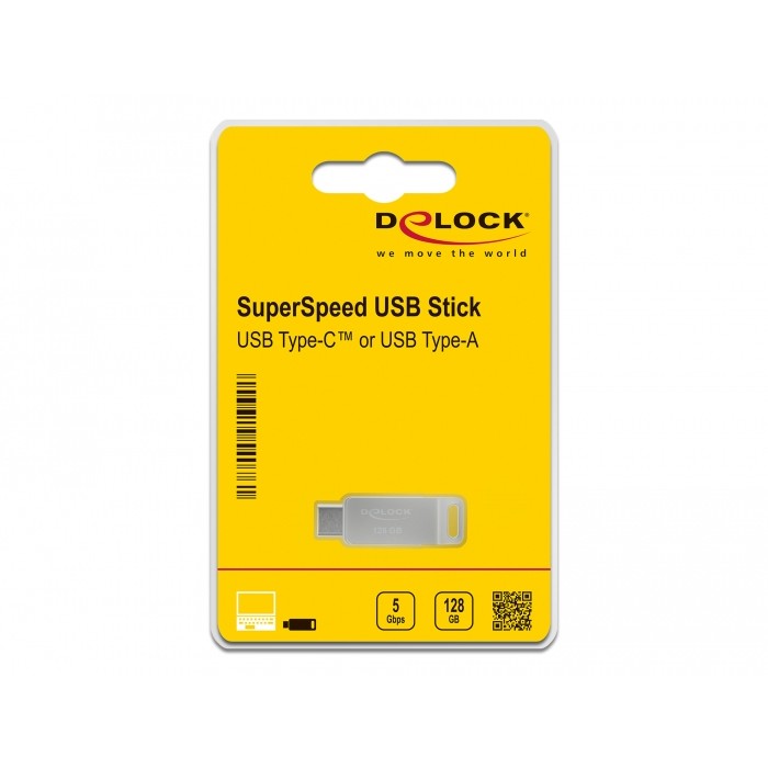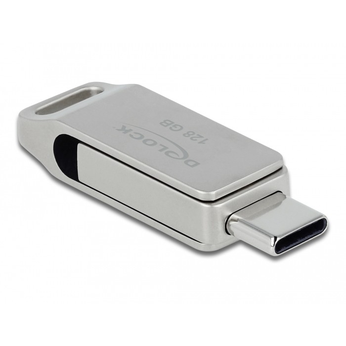 DeLOCK USB 5 Gbps USB-C + Type-A Memory Stick 128 GB – Metal Housing. 128 GB. USB Type-A / USB Type-C. 3.2 Gen 1 (3.1 Gen 1). 71 MB/s. Swivel. Silver